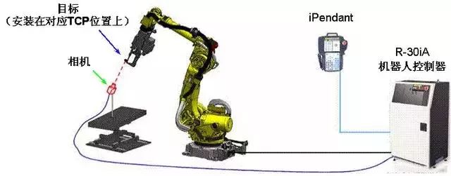 坐標系設置的另一種功能:通過視覺設置一個與視覺標定板對等的用戶坐標系。通過裝置在機器人手爪末端的相機,用戶坐標系UF設置在視覺標定板的原點位置(四點法),或當視覺標定板裝置在機器人手爪末端,則工具坐標系UT設置在視覺標定板的原點位置(六點法)。