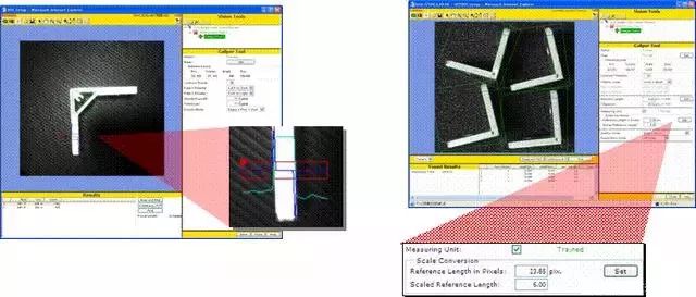 對應指定區域,偵測目標邊緣并測量兩條邊緣間長度(單位:像素pixel),乘以轉換因子可以換算為mm??梢詫繕伺帕屑捌焚|檢測等應用場合。