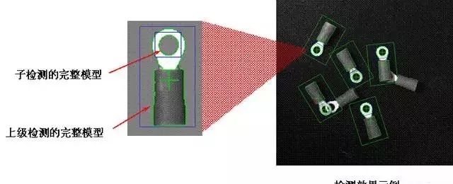 依據子檢測的結果,對應目標表面明顯特征(如孔,鍵槽)調整父檢測的定位位置,獲得更精確的偏移和旋轉數據。對不能以整個示教模型進行方向性定位的應用較有效。對一個上級檢測,可以使用多個下級子檢測來分析目標的多種局部特性。